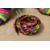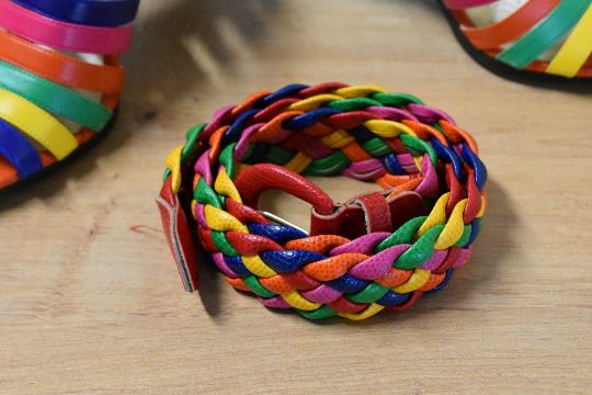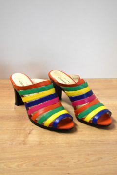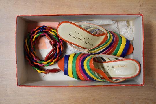 A pair of vintage Charles Jourdan 'Ulema' mules in multicoloured soft kid leather, size 6B, having 3' black heels and with a matching mock-snake multicoloured woven belt.