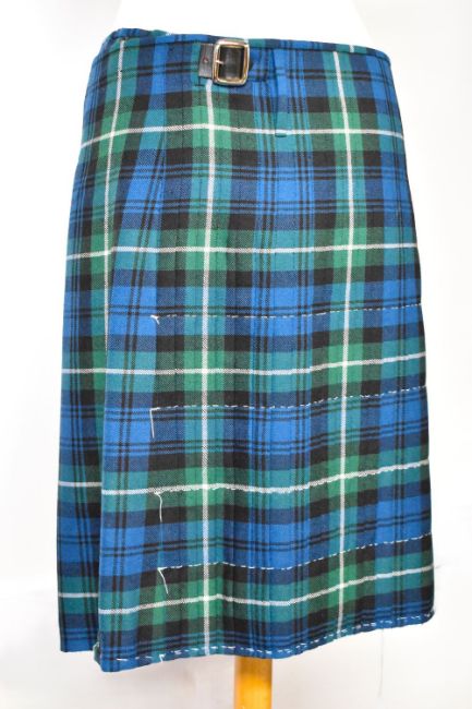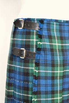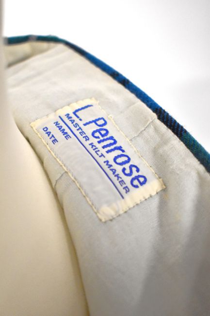 A 20th century L.Penrose kilt, in green, blue and black tartan with white accent stitching, pleated, with black leather straps and buckles to fasten.