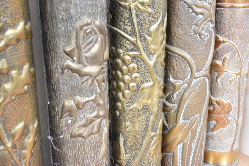 A group of nine French brass 75DEC Trench Art shell cases, each embossed in relief with foliate decoration, some near matching 35cm
