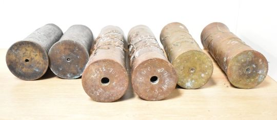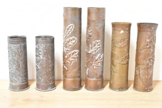 Three pairs of French and German World War I Trench Art shell cases, each hand-embossed in relief with foliate detail, two with acorns and oak leave designs, one of which is engraved Dixmude Nieuport to banners, largest 25cm
