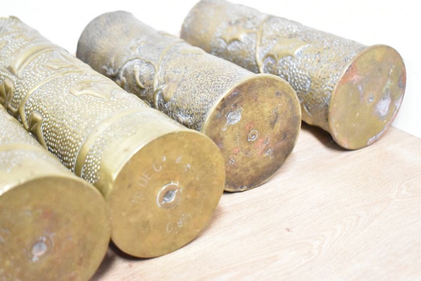 A good pair of French World War I brass 75DEC Trench Art shell cases, embossed and engraved with meadow blossoms within stylised flames, 35cm some knocks to ruffled rims, sold together with three pairs of brass World War I Trench Art shell cases, each with floral/foliate designs.