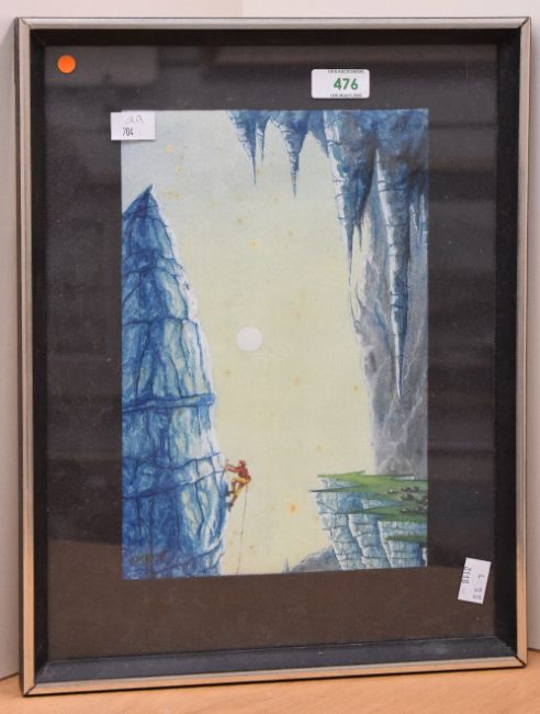 Artist unknown, late 20th century watercolour alpine scene, initialled and dated lower left, within black mount, silver and black frame, under glass. 27.5cm x 18.5cm, 39.5cm x 31cm overall. Sold alongside a pen and ink drawing of a Matchless Motors motorcycle, within off white mount, thin black frame and under glass. 15cm x 27cm, 30cm x 38.5cm overall. Also a colour print showing a Chinese mountain scene, signed indistinctly lower right, within gilt and black frame, under plexiglass. 50cm x 24.5cm, 52.5cm x 27.5cm overall.