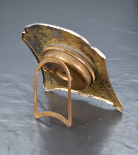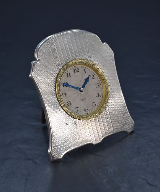 An early 20th century white metal (presumed silver) desk clock, having engine turned decoration to the front and engraved monogram to the reverse, 11cm x 9.5cm, 172g gross
