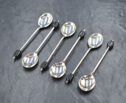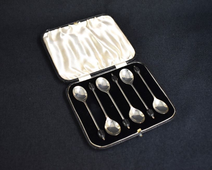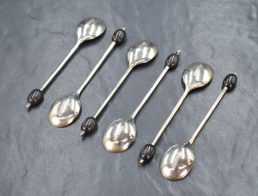 A cased set of six George V silver coffee bean spoons, having black coffee beans to the terminals, marks for Sheffield 1933, maker Viner's Ltd, 54g