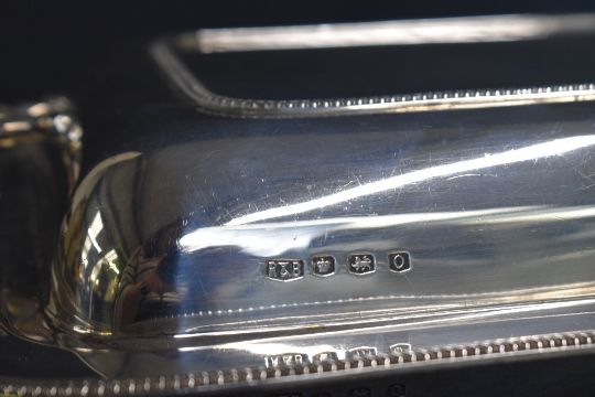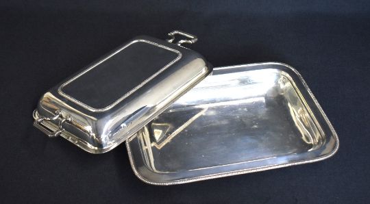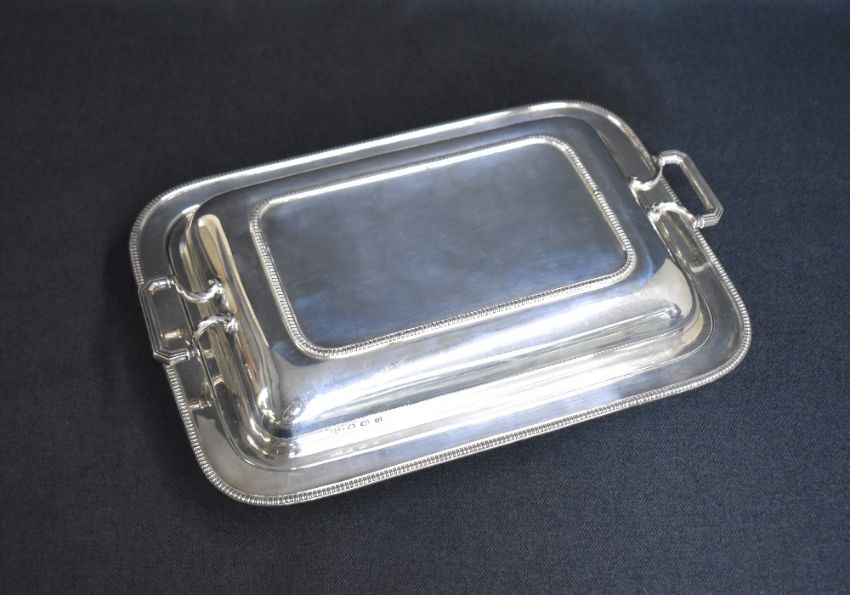 A George V silver serving dish, of rectangular form having egg and dart rims to the body and lid with angular handles, marks for Sheffield 1931, maker Roberts & Belk Ltd, 29.5cm x 21cm, 1471g