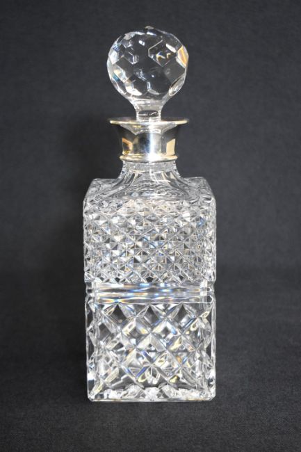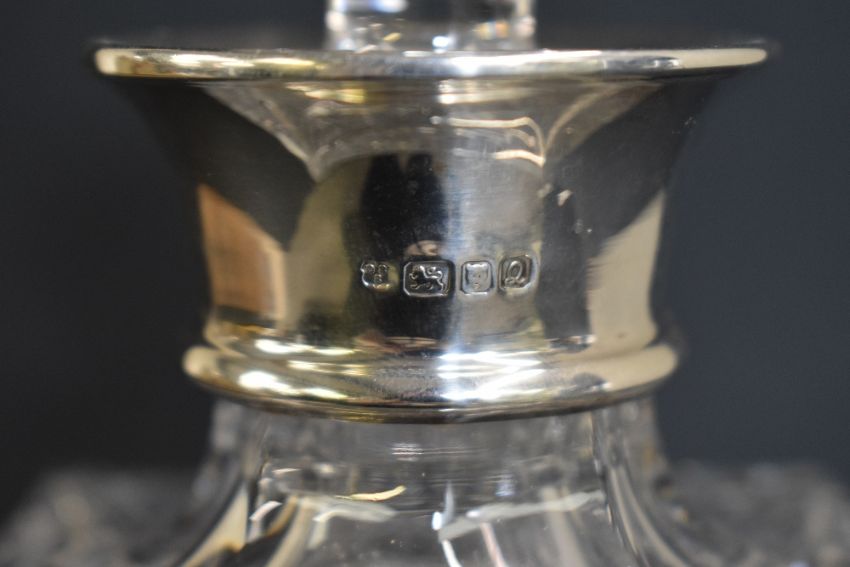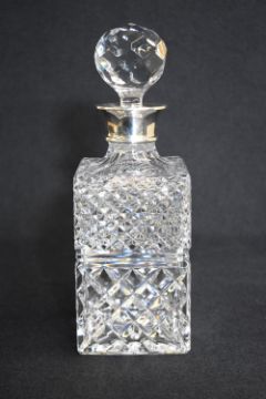An Elizabeth II silver mounted cut glass decanter, of rectangular form having a silver mount and moulded glass stopper, marks for London 1990, maker David Shaw Silverware Ltd, 29cm including stopper