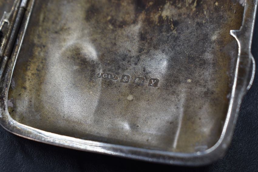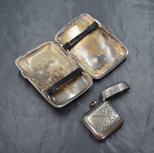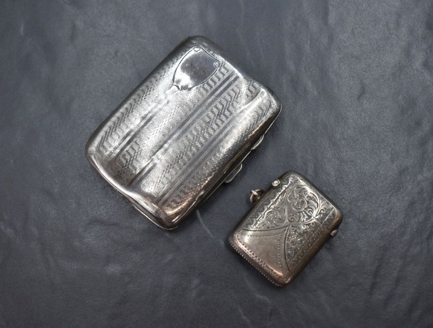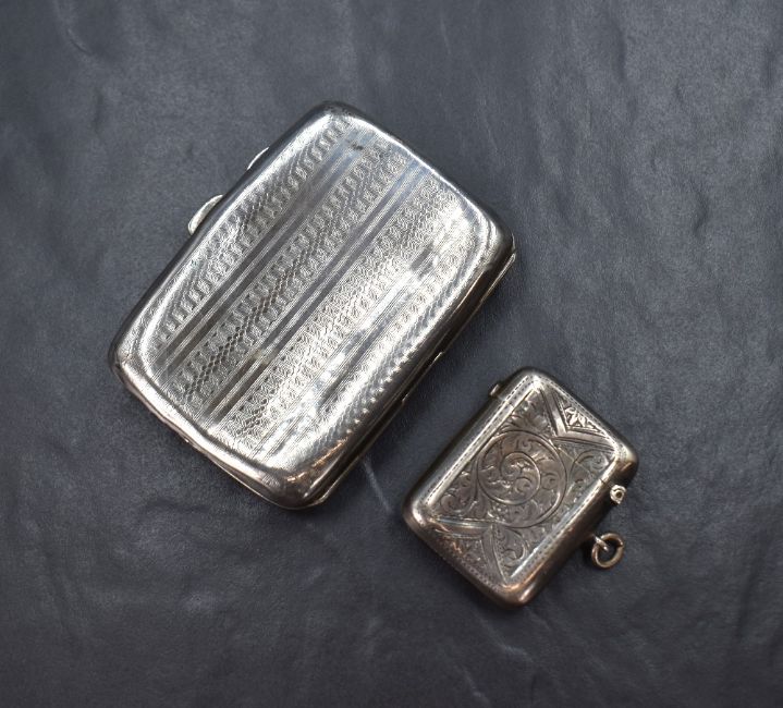 A George V silver cigarette case, of hinged rectangular form and slightly curved for the gentleman's pocket, having engine turned decoration with a vacant shield cartouche to the corner, 9cm x 6.5cm, marks for Birmingham 1923, maker Joseph Gloster Ltd, along with an Edwardian silver vesta case, having decorative scroll engraving, marks for Birmingham 1901, maker Arthur Cook, 88g gross