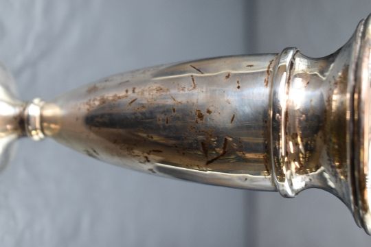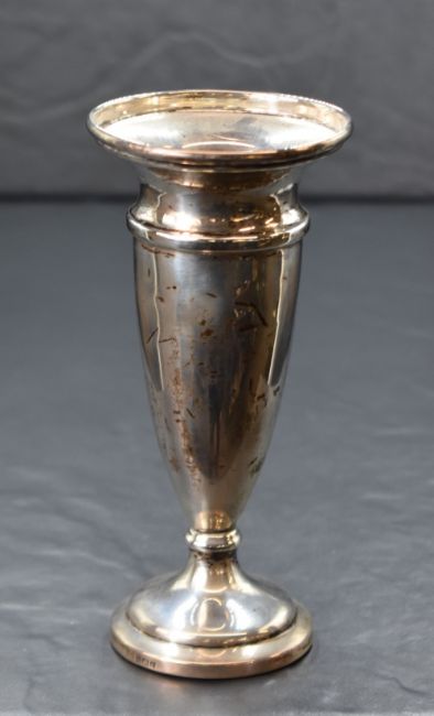 An Elizabeth II silver fluted vase, having a slightly flared rim with moulded decoration, raised on a small knopped stem and circular step moulded foot, marks for Birmingham 1966, maker Sanders & Mackenzie, 15.5cm, 143g (weighted)