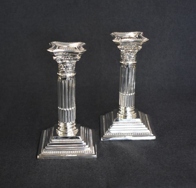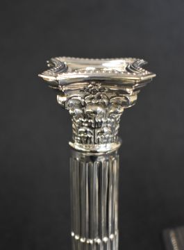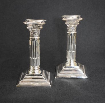 A pair of George V silver Corinthian column candlesticks, having concave square detachable sconces with bead trim, embossed decoration on filled moulded square step bases having bead trim, marks for Birmingham 1921, rubbed makers mark, 17cm