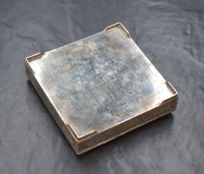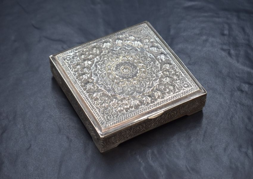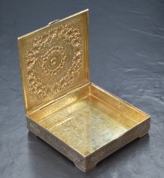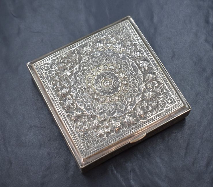 An Iranian white metal cigarette box, possibly 840. Or 875. grade, of square hinged form having floral mandala decoration, raised on four corner feet, marked Vartan. A. O., 84, 10cm, 236g