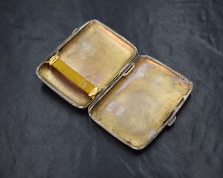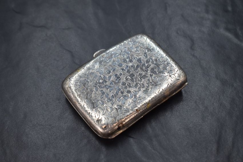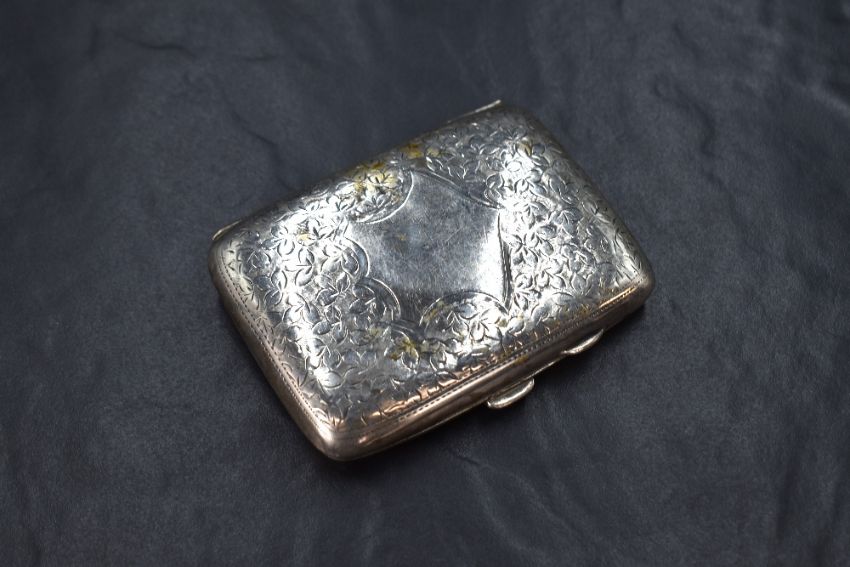 A late Edwardian silver cigarette case of hinged rectangular form slightly curved for the gentleman's pocket, having engraved floral decoration with a vacant shield cartouche, marks for Birmingham 1910, maker Joseph Gloster Ltd, 8.5cm x 6.5cm, 61g