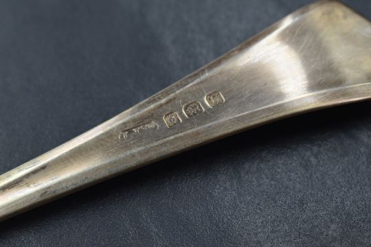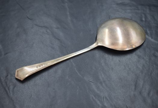 A George VI silver Hanoverian style serving spoon, having an angular terminal and large shallow bowl, marks for Birmingham 1944, rubbed makers mark, 69g