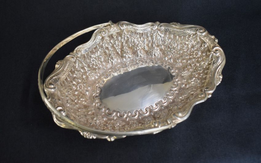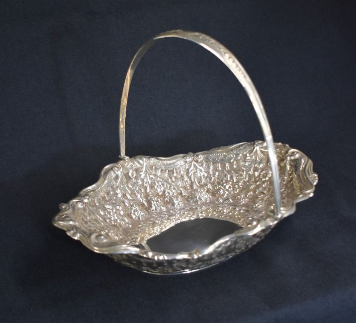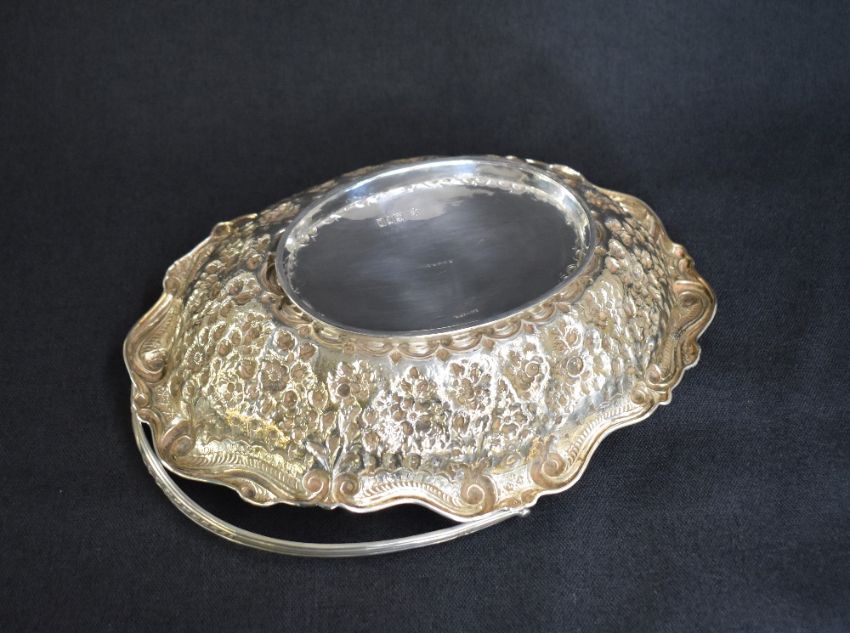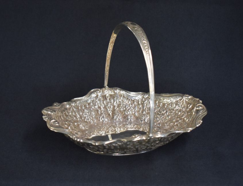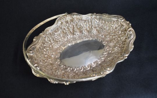 A late Victorian silver fruit bowl, of oval form having a handle with thread and embossed foliage decoration, scroll rim to the bowl with embossed floral and scroll decoration to the body, marks for London 1900, maker Horace Woodward & Co Ltd, 538g