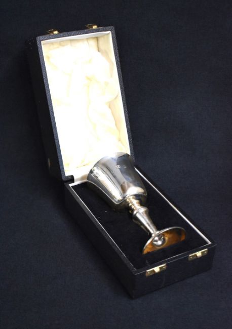 A cased Elizabeth II silver cup, of traditional form having a slightly flared rim, gilted interior raised on a knopped stem and circular step moulded foot, marks for Birmingham 1975, maker W I Broadway & Co, 166g