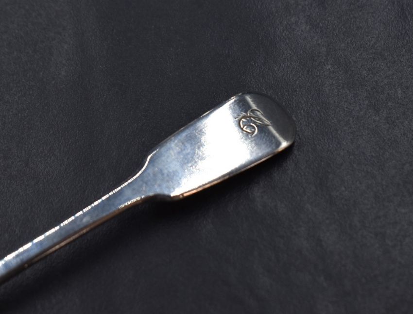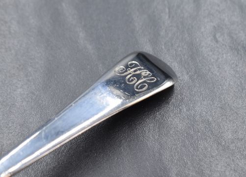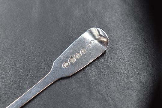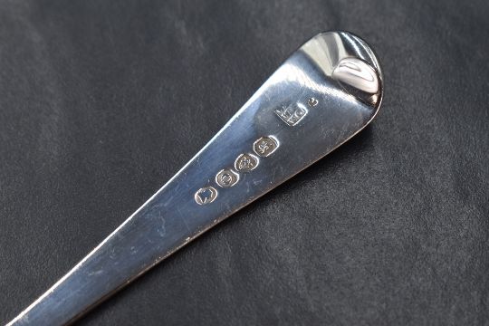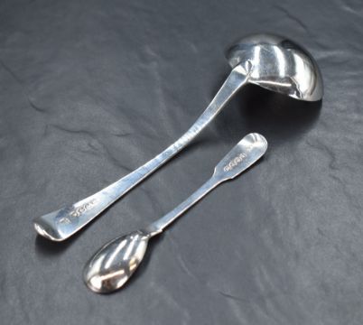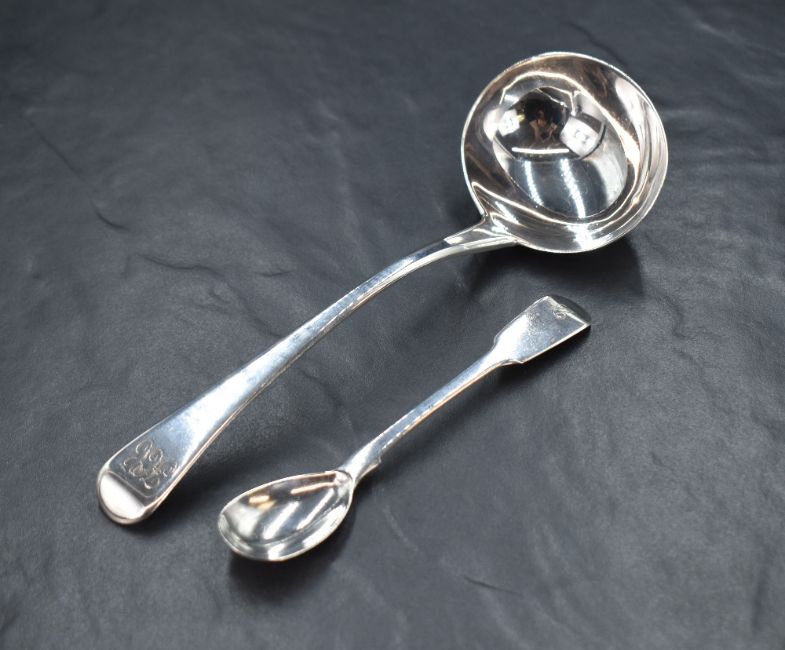 A George III silver Old English pattern sauce ladle, having 'KC' to the terminal, along with a William IV silver fiddle pattern condiment spoon, having 'C' to the terminal, marks for London 1789, 1831, makers William Eley I, William Fearn & William Chawner and Cornelius Bland, 68g