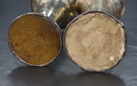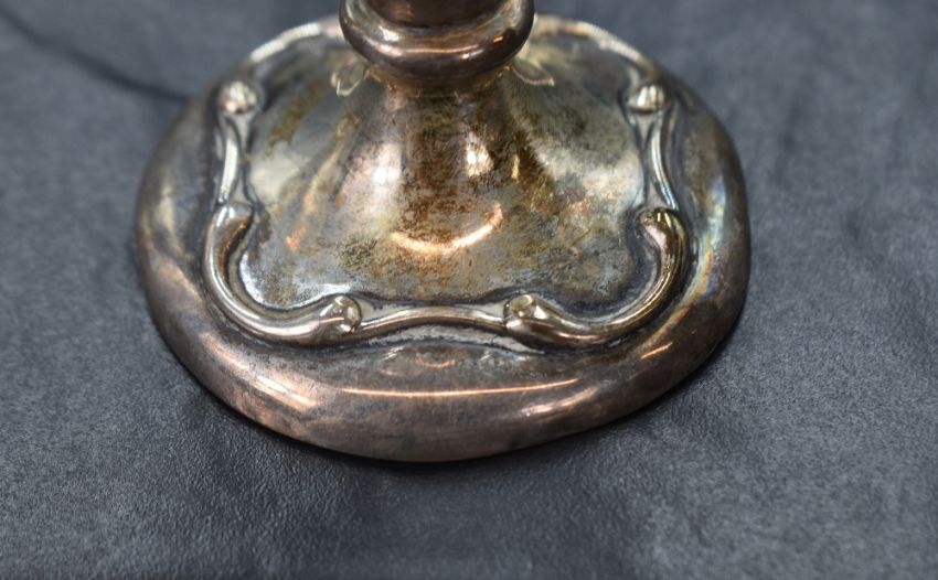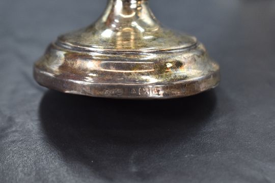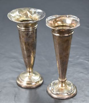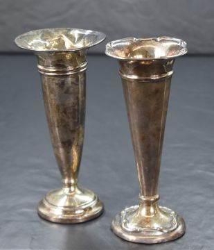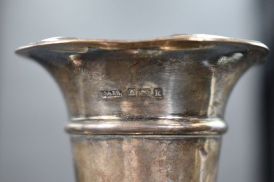A late Edwardian Art Nouveau style silver vase, of fluted form having a quatrefoil rim with moulded decoration, raised on a circular foot having further moulded decoration, marks for Birmingham 1909, maker A & J Zimmerman Ltd, along with a further George V silver vase, also of fluted form with step moulding, marks for Birmingham 1925, maker Hobson, James & Gilby, 14cm, 205g gross (weighted)