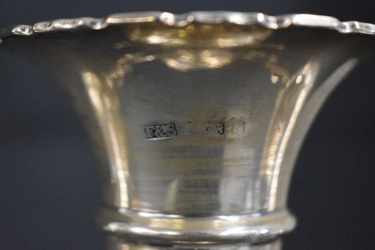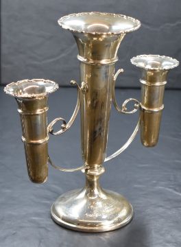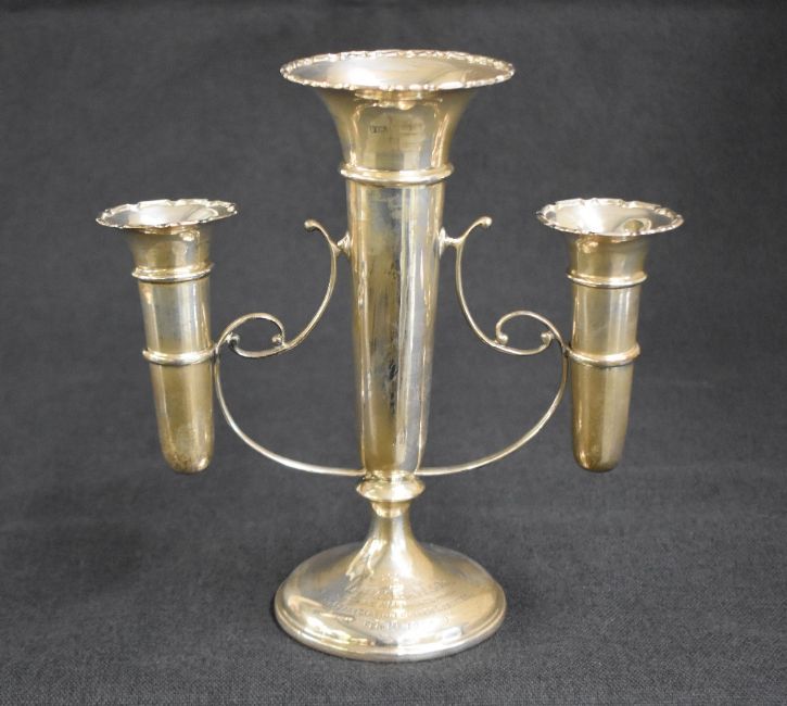 An early 20th century silver epergne vase, the central fluted vase having Chippendale style rim with scrolling arm attachments for a further two fluted vases, raised on a circular step moulded foot having a personalised inscription dated 1920, rubbed hallmarks, 21.5cm x 21cm, 504g (weighted)