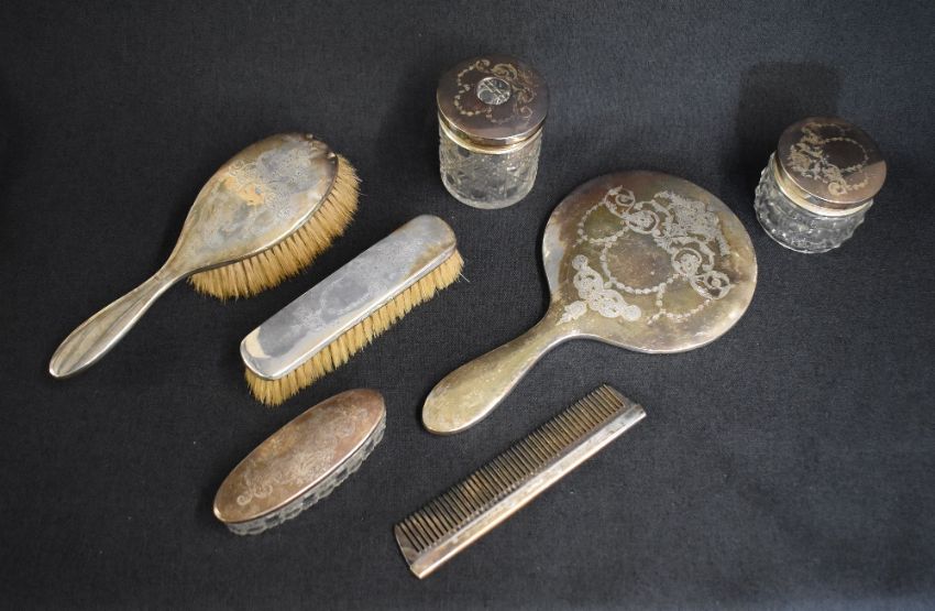 A George V silver mounted vanity set, comprising a hair brush, a clothes brush, comb, a mirror, along with three silver capped cut glass powder pots, all with engraved scroll floral decoration, marks for Birmingham 1916, maker Synyer & Beddoes, some with dents to bodies and some silver mounts loose
