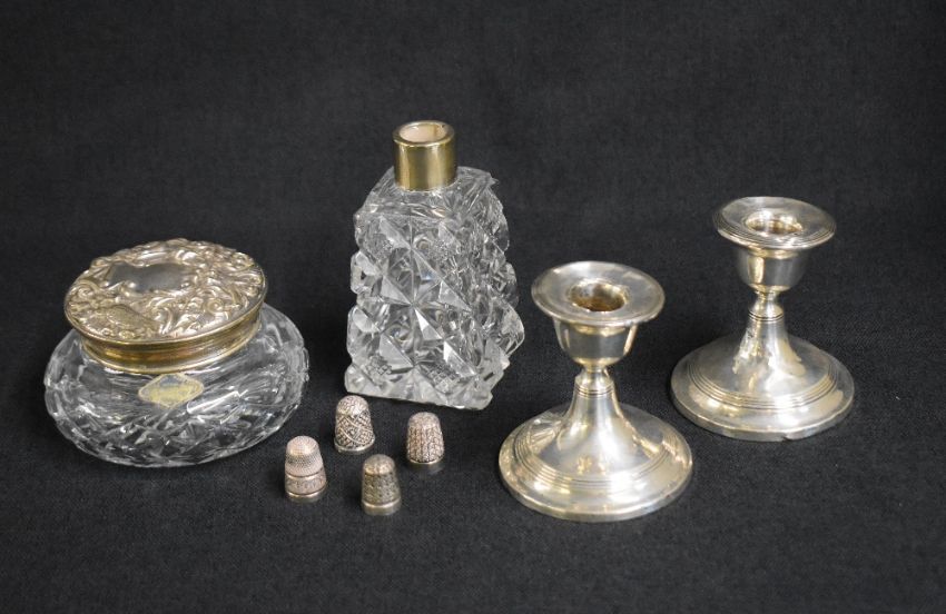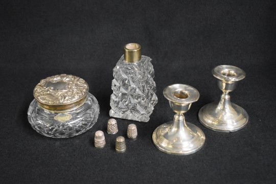 A pair of late Edwardian silver candlesticks, of traditional form having step moulding decoration, marks for Birmingham 1910, maker possibly William Adams Ltd, along with a silver capped cut glass powder pot, a silver mounted scent bottle and four silver thimbles, marks to include Chester, Birmingham, London, 1893, 1898, 1912, 1976, makers Brockwell & Co, Charles Horner, Henry Griffith & Sons Ltd