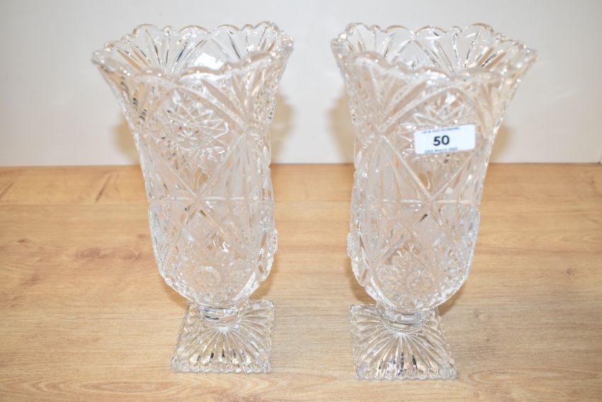 A pair of cut crystal tulip vases supported on a square base, h26cm