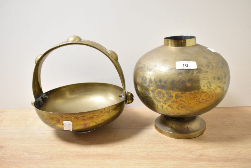 An early 20th century Indian Kamandalu brass holy water carrier having loop handle, engraved with floral patterns, h40cm