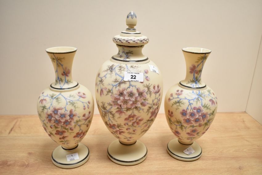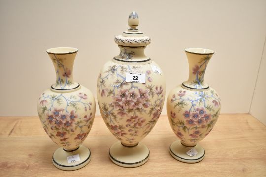 A late 19th Royal Bon style lidded vase hand painted with floral patterns and gilt edging, h32cm, sold together with a similar pair of vases, h25cm