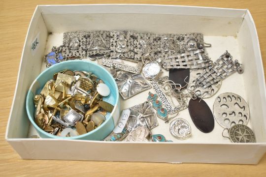A collection of costume jewellery, including silver earrings, cufflinks and statement bracelets, etc
