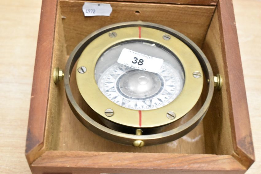 A Steamer Brand nautical brass compass encased in a mahogany lidded box, w16cm
