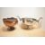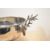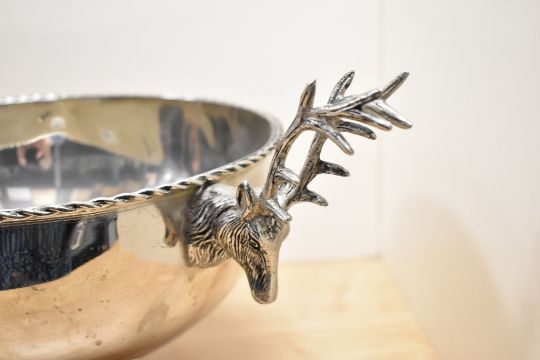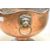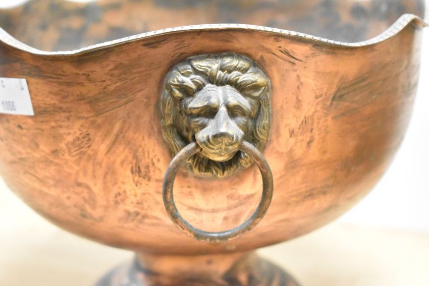 A large white metal wine cooler having stag head handles protruding from the steep bowl form, h19cm, sold together with a copper planter having lion head handles, h19cm