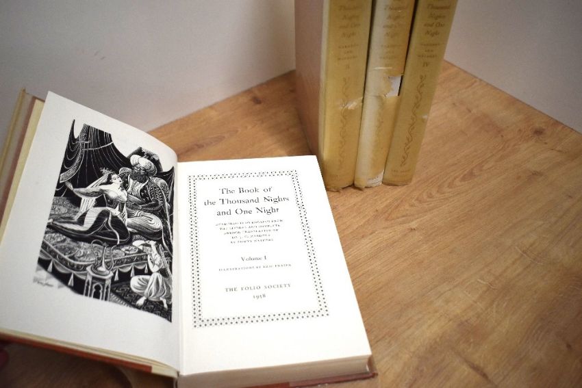 Folio Society. Mathers, Powys [Ed.] - The Book of the Thousand Nights and One Night. London: The Folio Society, 1958. In four volumes. Illustrated by Eric Fraser. Original binding, in the glassine wrappers. (4)