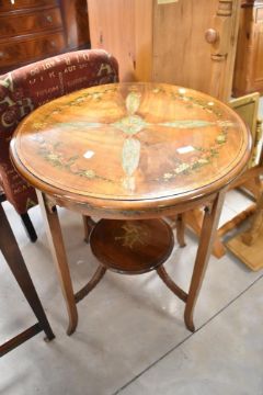 An Edwardian occasional table having circular top and undertier, with painted foliate decoration, diameter approx. 60cm