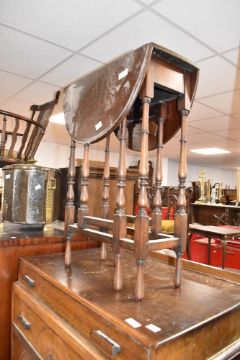 A reproduction mahogany drop flap occasional table on delicate turned frame