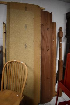An untreated wooden four poster bed, possibly mahogany , dismantled