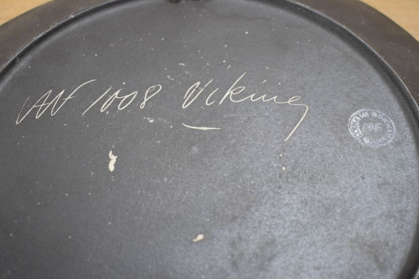 An attractive mid-century wall plate depicting a Norwegian Viking ship decorated in red, blue and orange enamel, H27cm, sold together with a ceramic green glaze lighter, h10cm.
