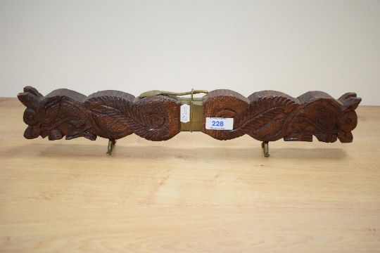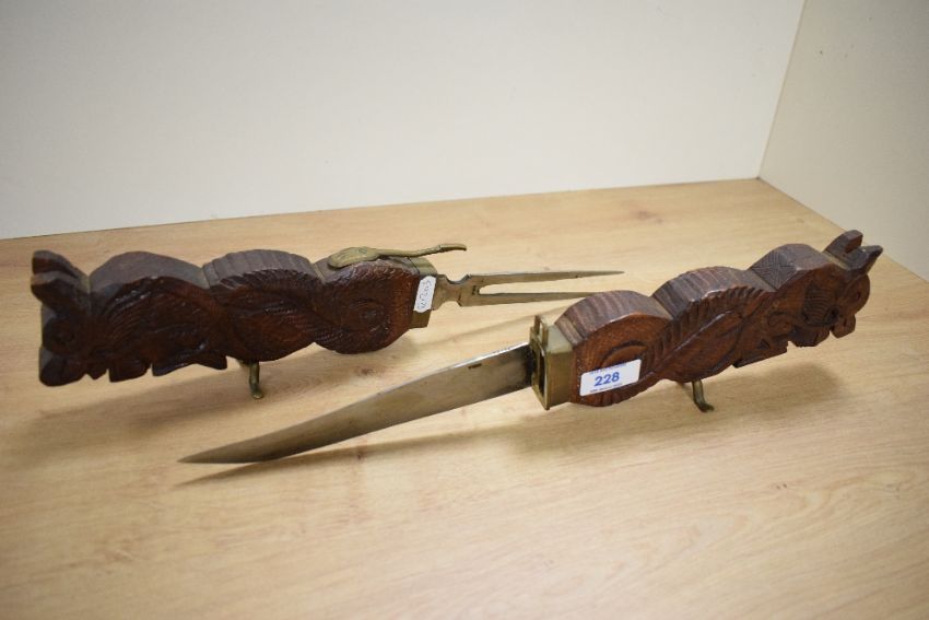 A mid / late 20th century Indian carving set, carved depicting a double headed dragon on brass mounts, impressed mark 'India' on both knife and fork, L44cm.