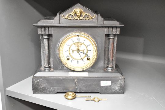 An early 20th century slate mantel clock having visible escapement, flaked either side with Doric fluted columns, plaque dated for 1910, h30cm