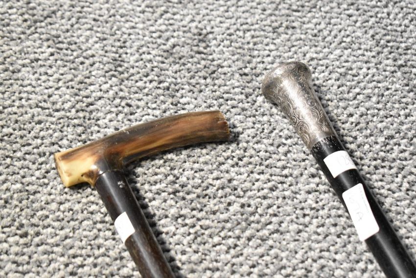 An early 20th century ebonised walking stick, having a silver mounted top decorated with acanthus leaf, hallmarked for London, c.1920, L91.5cm, sold together with another walking stick, ( 2 )