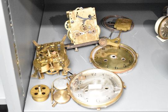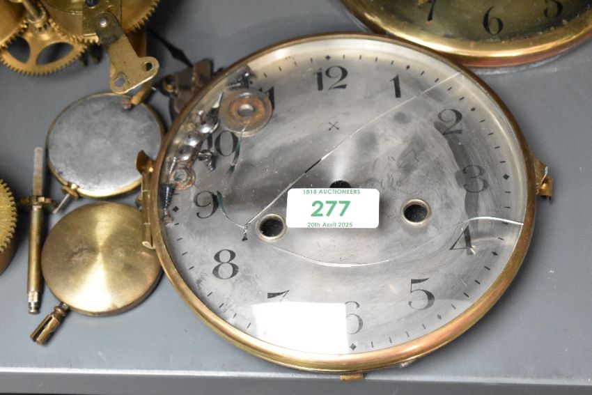 An early 20th century brass clock dial, w15.5cm, sold together with another clock face, 2 movements and various other spare parts.. Condition report: glass face damage on one barometer