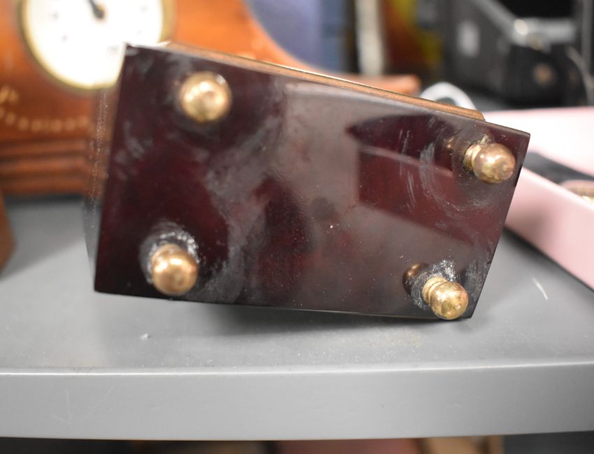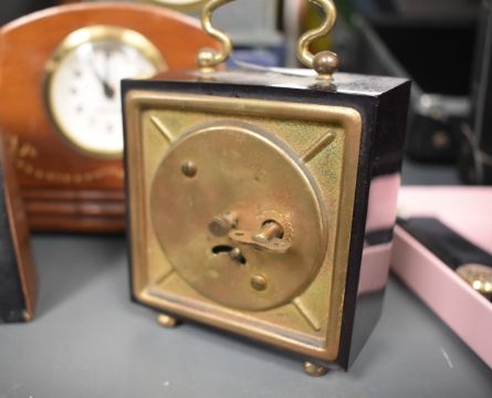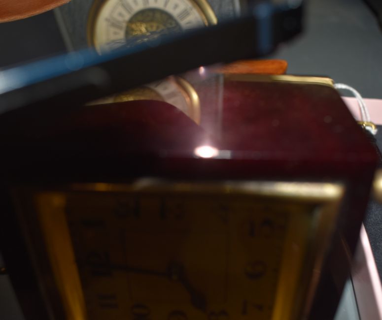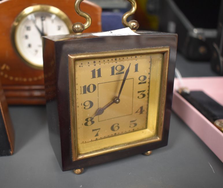 An early 20th century deep red bakelite miniature travel clock, H10cm, sold together with various other mantel clocks, ( 5 )