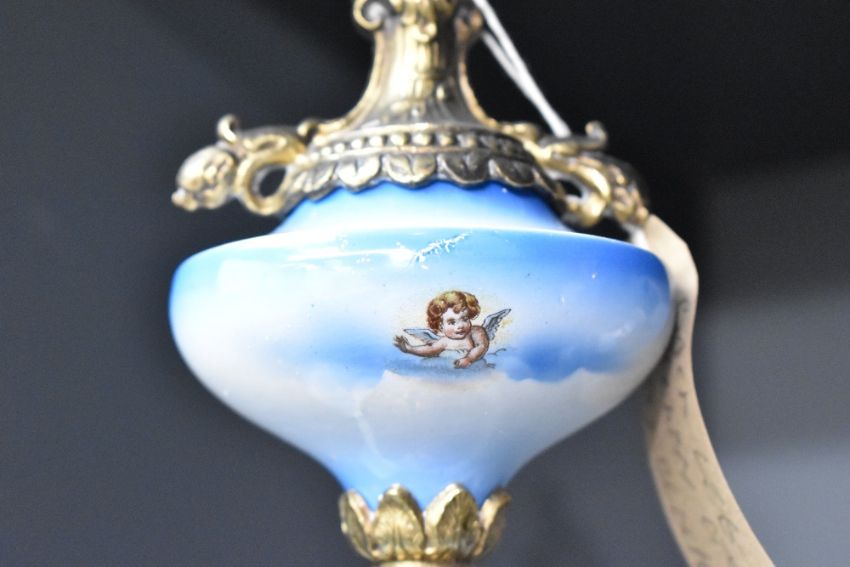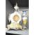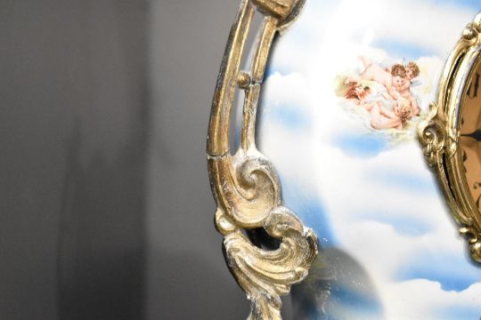 A Franz Hermle (Germany) porcelain mantel clock and garniture, hand coloured with playful cherbs within a landscape scene, h50cm Condition report: Clock loose in case and missing one foot.