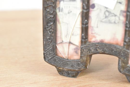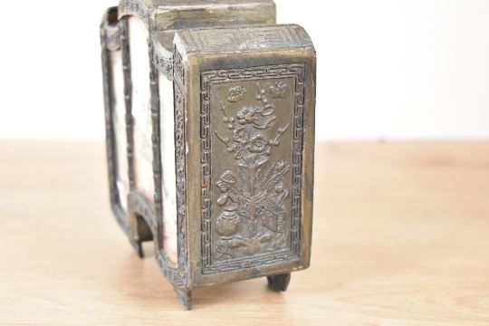 An early 20th century Chinese pewter tea cannister, decorated with glass inserts over traditional printed scenes, stamped to base with impressed Chinese character marks, h16.5cm