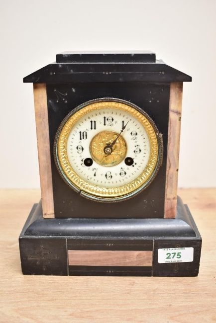 A late 19th century French slate 8 - day mantel clock having enable dial and Roman numerals, h23cm Condition report: Appears to not be working