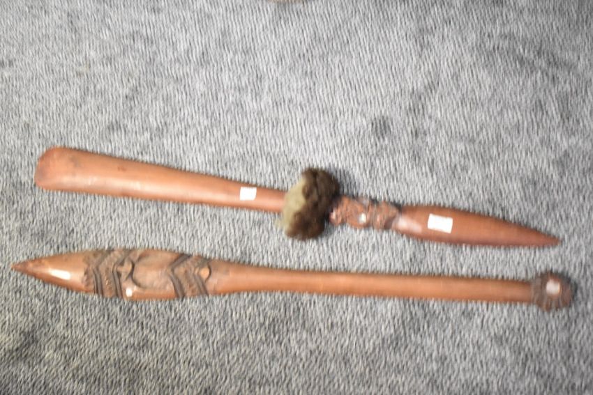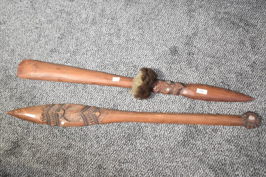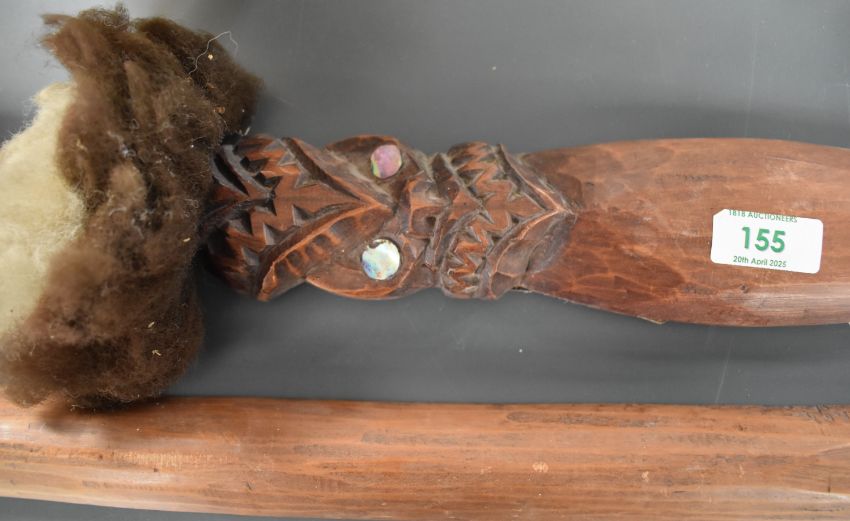 A tribal hand club style Taiaha, carved with inlaid mother of pearl paua eyes, L91cm