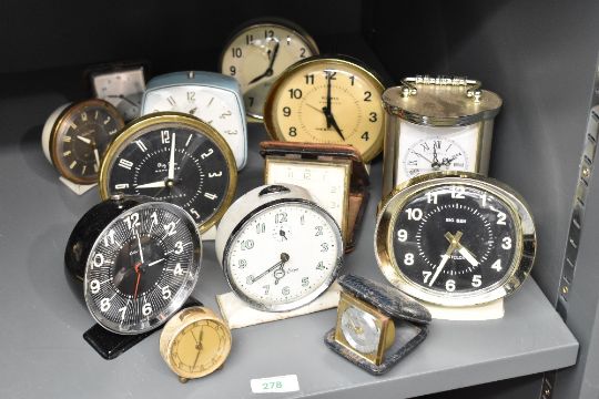 A mid-century 'Smiths' travel clock in original brown leather case, w8cm, sold together with a Big Ben alarm clock, a carriage clock and a Columbia clock ect, ( 13)