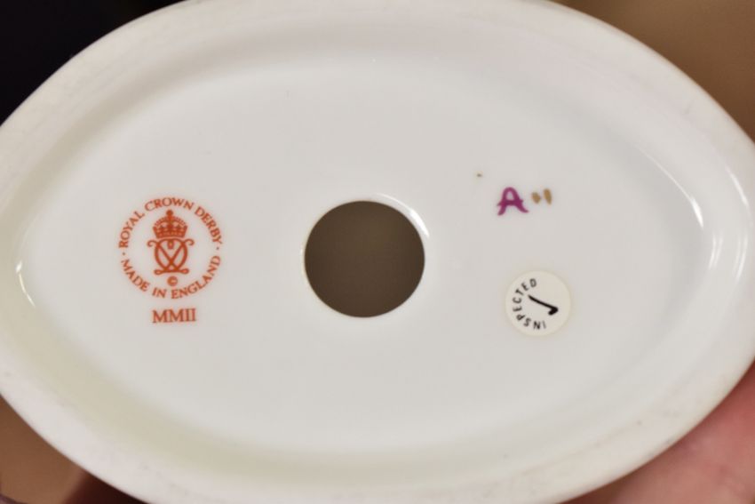 A Royal Crown Derby Noah's Ark bone china figure having original box, h7cm, sold together with a Royal Crown Derby miniature churn, (2). Condition report: Churn missing lid
