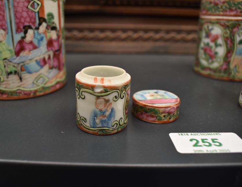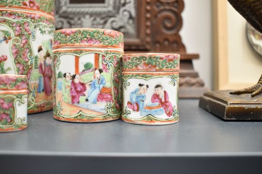 A group of 5 Chinese Canton Famille Rose porcelain jars with covers, hand painted with floral patterns and traditional figures, largest h11.5cm, ( 5 )