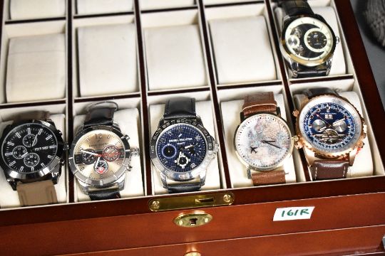 A wooden watch display and storage box with key , having fifteen section with below draw, containing a selection of costume wristwatches, including Daniel Hechter, 29.5cm x 14cm