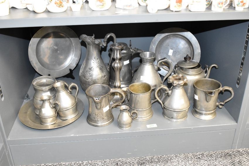 A quantity of pewter tankards of various sizes, largest h13cm, sold together with a candlestick, ewer and 2 plates ( 16)
