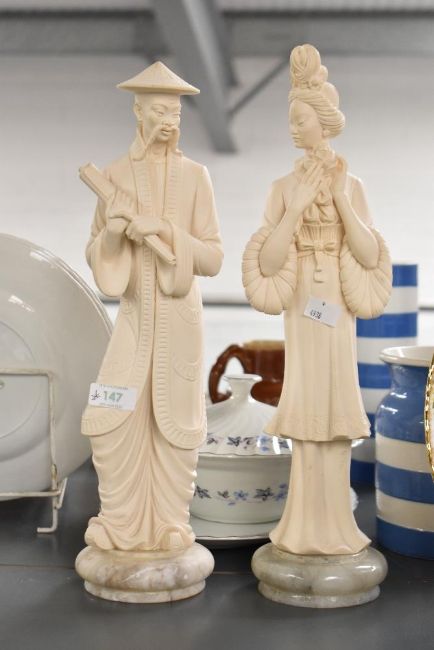Two oriental cast composition figures depicting a male holding a scroll and a female holding a flower, both on marble bases standing at 41cm tall.