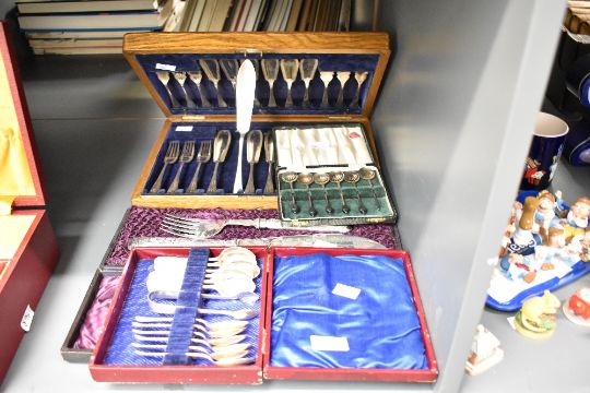 A set of 6 vintage silver plated spoon set in a blue velvet case, w17.5cm, sold together with another spoon set, a silver plated fish set and a cutlery canteen, (4)
